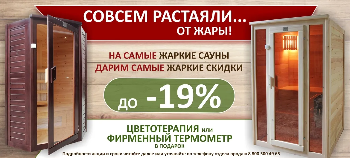 *Скидка 19% действует на все финские и инфракрасные сауны с керамическими нагревателями, скидка 9% действует на все инфракрасные сауны с карбоновыми нагревателями. При покупке любой инфракрасной сауны - дарим цветотерапию, при покупке финской сауны -  фирменный термометр. Акция действует до 10 апреля 2019 г.