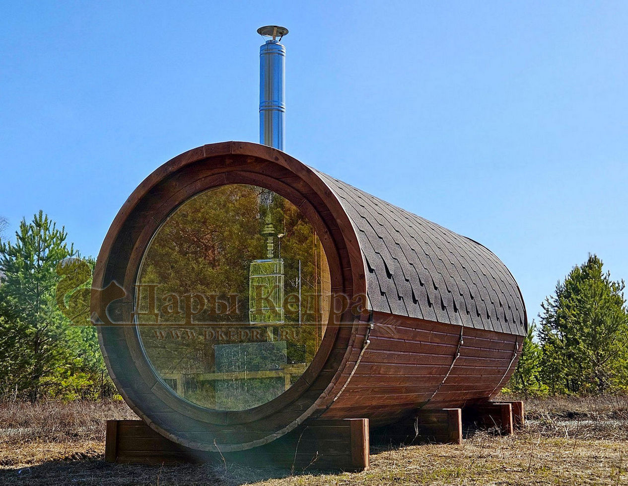 • Баня-бочка «Орео» с панорамным окном Стильная и современная баня-бочка может быть выполнена длиною от 3 метров, что-бы парильное отделение было не менее 2,5 метров для безопасного расстояния человека от печи. Полок одноуровневый, что позволяет в полной мере наслаждаться видом из панорамного окна. Печь идёт с внутренней топкой по центру, её можно установить сбоку с топкой внутри, снаружи, либо вынести топку в соседнее отделение. Печь можно укомплектовать баком для воды, а саму баню сделать длиною до 6 метров, комфортно разместив в ней дополнительно помывочную и комнату отдыха. Если вы хотите добавить круглое окно (полукруг) в комнате отдыха, то предлагаем рассмотреть модель с боковым входом. Обращаем Ваше внимание, по умолчанию в данной модели отсутствует бак для воды, вместо него идёт утеплённая термо-труба, которую можно заменить на бак по желанию.