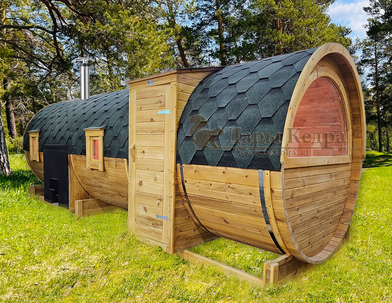 • Баня-бочка буханка из кедра 4 метра Это более просторная модель за счет увеличенной высоты потолков и ровного пола. В такой модели раздевалка совмещена с моечной. Тут установлен душевой поддон, вешалка, полочка и лавочка из кедра. В парильном отделении по обе стороны расположены двухуровневые открытые полки, печь находится между ними у дальней стены. Время растопки такой бани не превышает 30 минут. По вашему желанию баню-бочку можно укомплектовать козырьком, верандой и печью с внешней загрузкой, благодаря которой весь мусор во время топки остается на улице. Баня-бочка буханка не требует полноценный фундамент, поэтому при необходимости ее можно перенести в другое место. Обращаем Ваше внимание, что в стандартную комплектацию бани входят полки открытого типа в парной с обеих сторон. Дополнительно можно заказать полок закрытого типа или лавку! Кедр обладает ароматическими свойствами. Он не деформируется и влагоустойчив, при правильном уходе за деревом на нем не развиваются грибки и плесень.