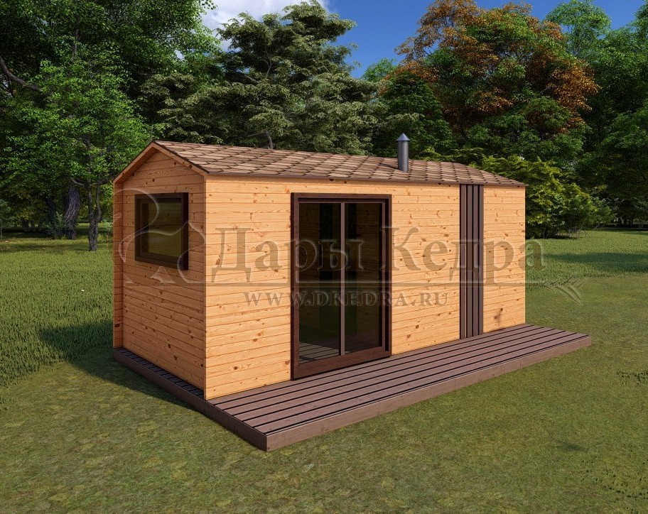 Каркасно-щитовая баня из кедра «Мини» с верандой Это классическая прямоугольная модель бани с двумя отделениями: парилкой и раздевалкой. Для удобства пользования раздевалка оснащена лавочкой и вешалкой. Парилка оборудована двухуровневым открытым полком и печью. За счет небольшой конструкции баня нагревается в течении 30 минут. На просторной веранде можно оставить вещи или отдохнуть после парения. Каркасно-щитовую баню можно заказать как в готовом, так и в разборном варианте. В разборной модели готовые щиты из кедра быстро собираются в полноценное строение, что также позволяет исключить лишний строительный мусор. Такая баня не требует полноценный фундамент, поэтому при необходимости ее можно перенести в другое место. Обращаем Ваше внимание, что в стандартную комплектацию бани входит полок открытого типа в парной. Дополнительно можно заказать полок закрытого типа или лавку! Древесина кедра насыщена эфирными маслами и фитонцидами, которые активируются при воздействии температур. Таким образом, парение в каркаско-щитовых банях из кедра становится еще полезнее.