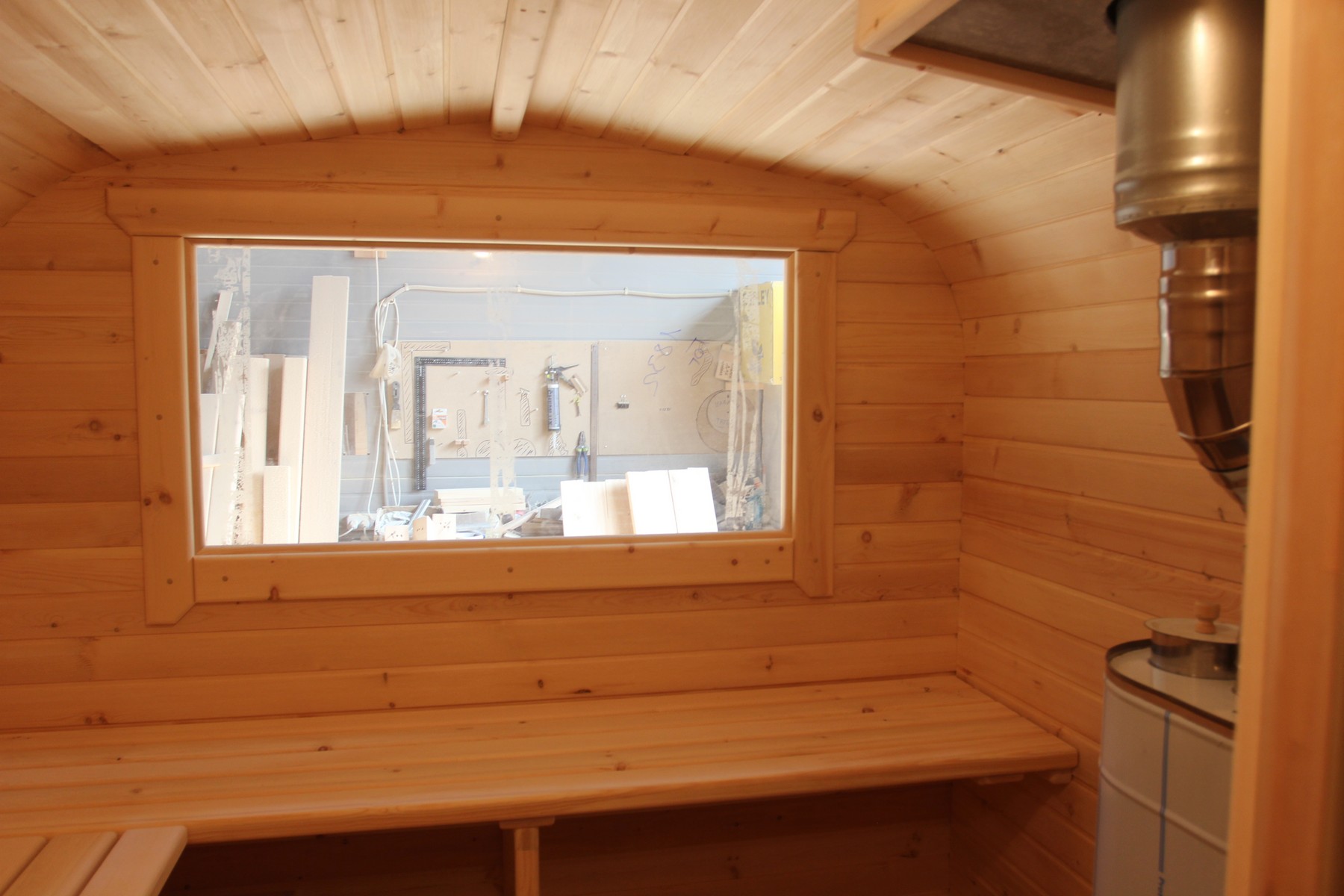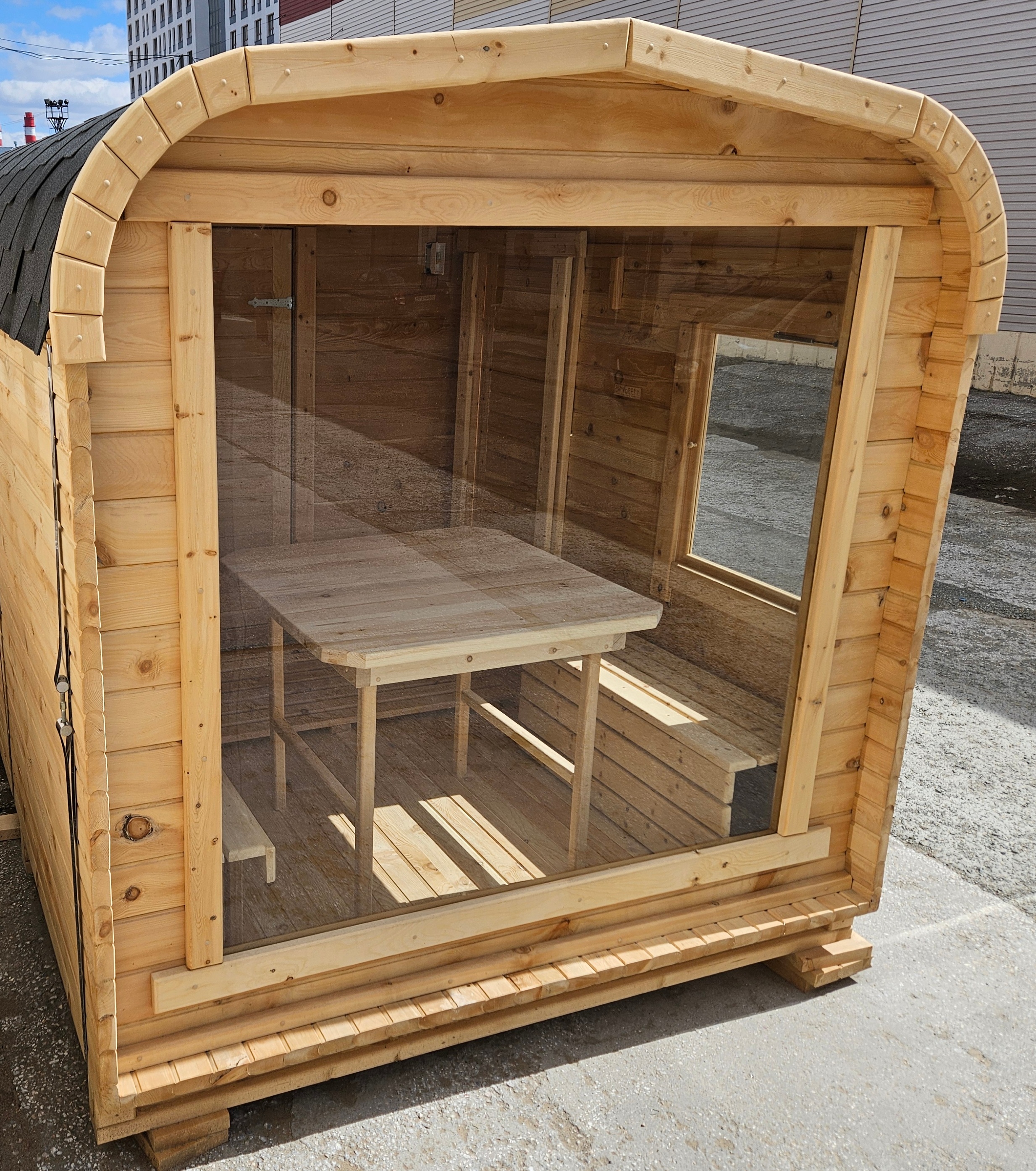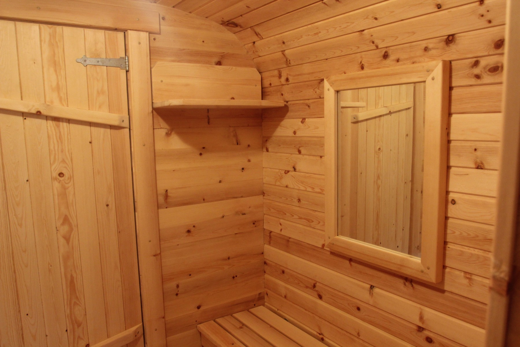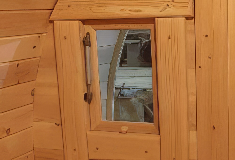 Окна из закаленного стекла (панорамное), можно разместить, как в парилке, так и в комнате отдыха. Может быть установлено только на торцевых (ровных) стенах бани. За дополнительную плату возможно сделать стекло бронзированным.