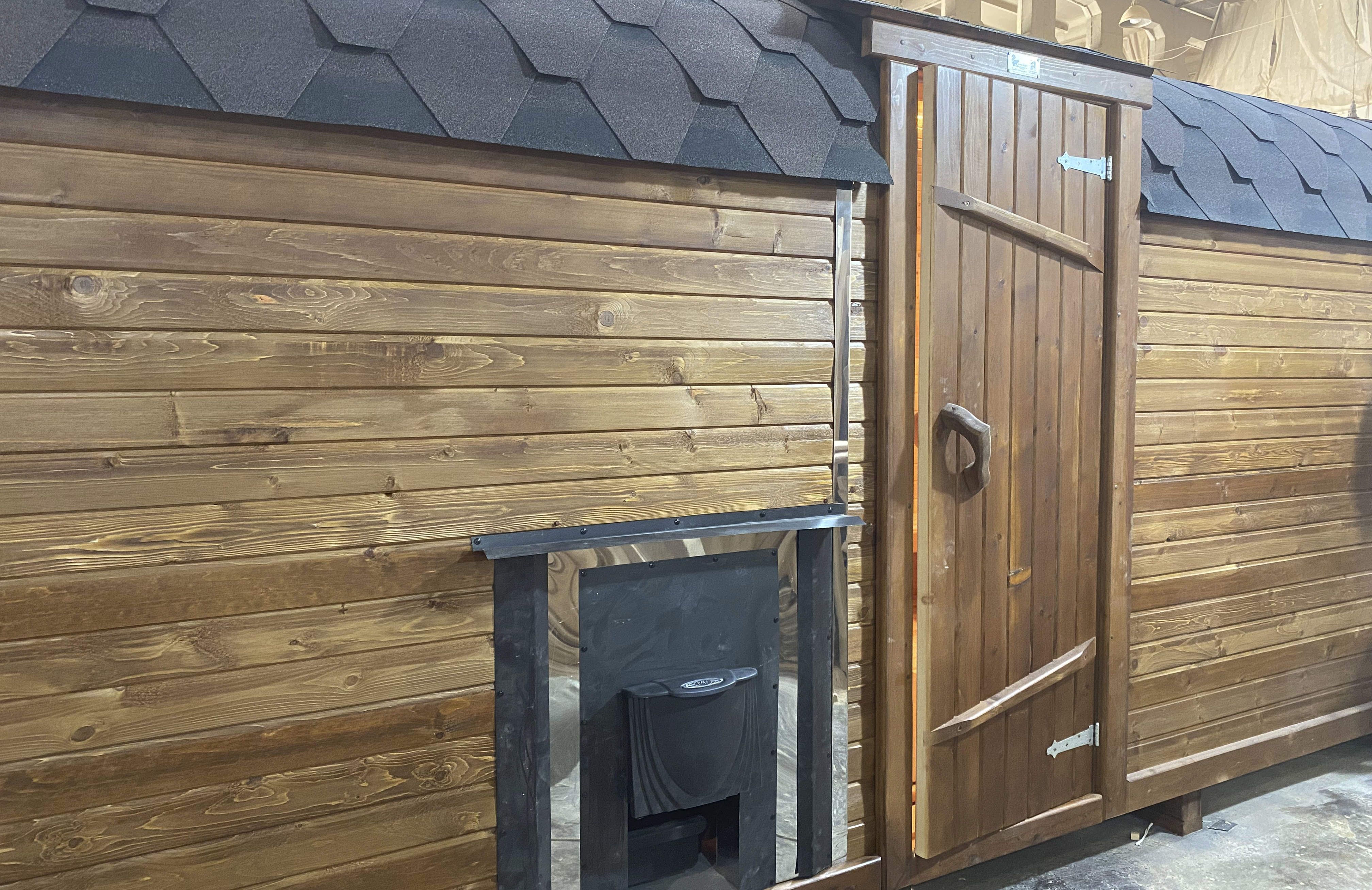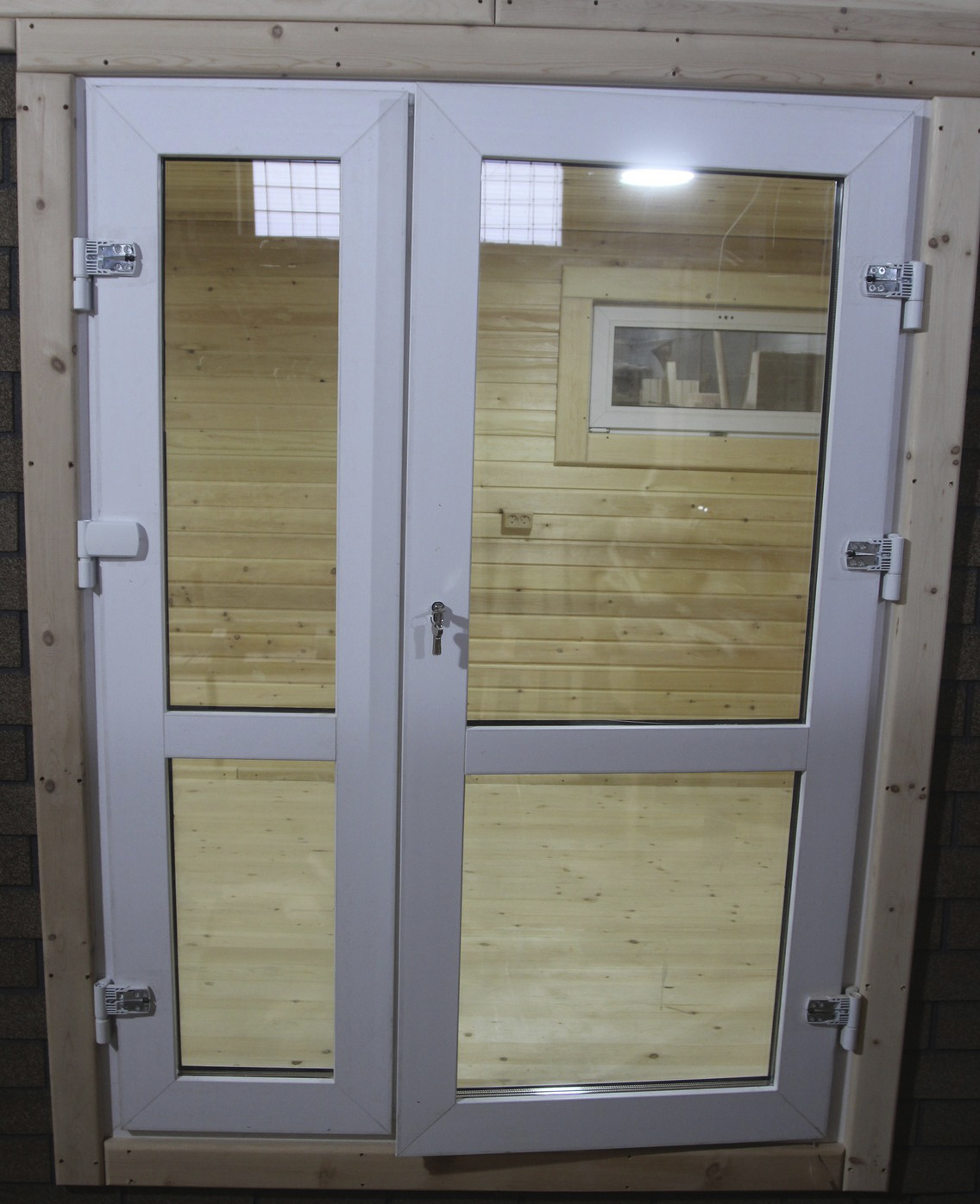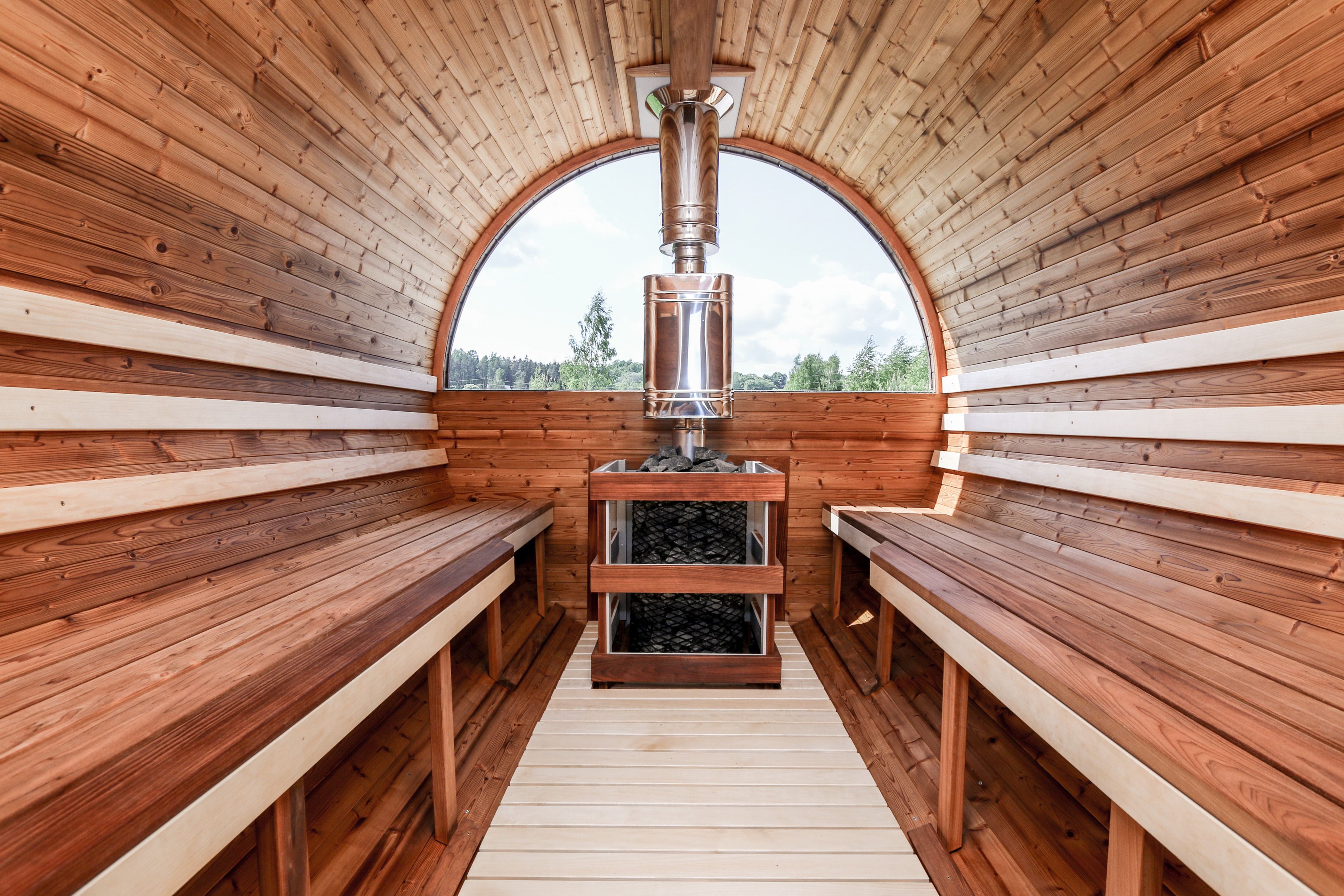Окна из закаленного стекла (панорамное), можно разместить, как в парилке, так и в комнате отдыха. Может быть установлено только на торцевых (ровных) стенах бани. За дополнительную плату возможно сделать стекло бронзированным.