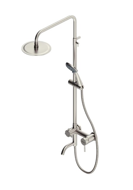 Изготовлен из качественной хромированной стали, устойчивой к гидроударам, коррозии. Оснащен удобной верхней лейкой на штанге для комфортного принятия душа без участия рук, а также ручной лейкой и краном с длинным изливом и рычажным переключателем для комфортного набора воды в ёмкости и уборки душевой зоны.
