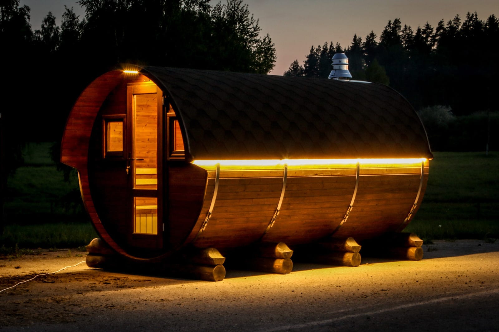 Дополнительный источник света в темное время суток, а также с подсветкой баня будет выглядеть еще более оригинальной.