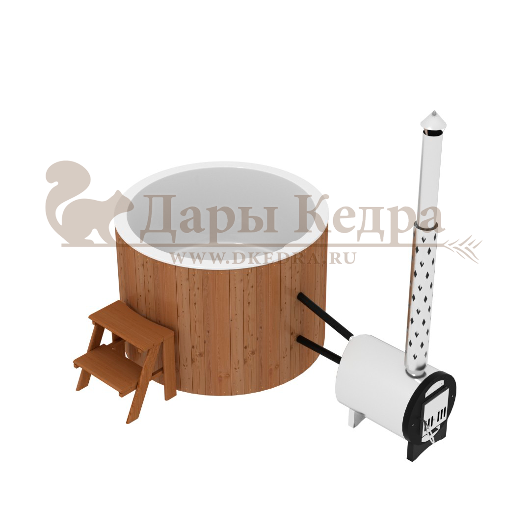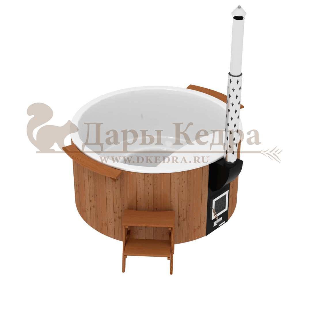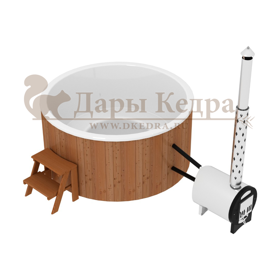• Фурако круглая из кедра с литой термопластиковой вставкой с внешней печью Это уличная подогреваемая купель с круглой внутренней чашей из термопластика, которая имеет цельную форму вместе с сиденьями и дном. Для удобства пользования купель фурако оборудована приставной лестницей. Подогрев воды осуществляется за счет внешней печи с дымоходом. Термопластик устойчив к воздействию температур, облегчает уход за фурако и увеличивает срок ее службы. Парение на свежем воздухе – это отличный способ укрепить здоровье и поддержать организм в тонусе.