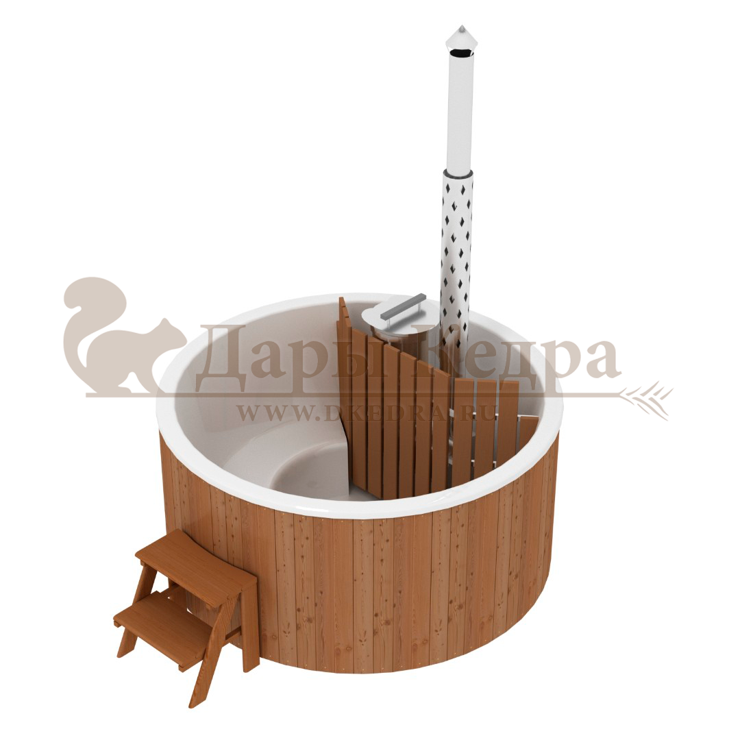 • Фурако круглая из кедра с термопластиковой вставкой со встроенной печью Это уличная подогреваемая купель с круглой внутренней чашей из термопластика. Для удобства пользования купель оборудована лавочками, приставной и внутренней лестницей. Нагрев воды происходит за счет встроенной печи, которая находится внутри купели за перегородкой. В комплектацию этой модели входит савок с длинной ручкой, который позволяет извлекать угли после эксплуатации изделия. Термопластик устойчив к воздействию температур, облегчает уход за купелью и увеличивает срок ее службы. Парение на свежем воздухе – это отличный способ укрепить здоровье и поддержать организм в тонусе.