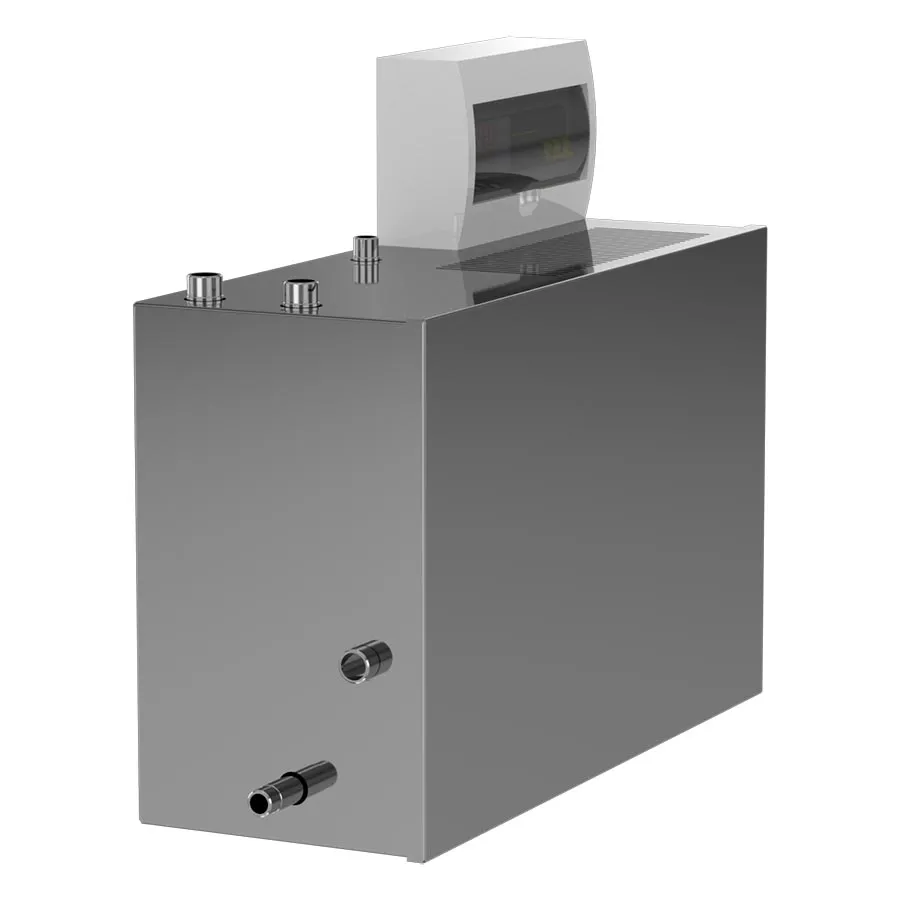 • Парогенератор проточный, 2 кВт с выносным цифровым пультом управления Устройство служит для образования пара путем закипания воды. В металлическом корпусе парогенератора находится бак для воды со съемной аромаемкостью в виде сеточки. Рядом располагается индикатор в виде трубки, благодаря которому осуществляется визуальный контроль за уровнем воды. Проточные парогенераторы подключаются к водопроводу и автоматически добавляют воду в прибор при ее расходовании. Для удобства пользования парогенератор имеет выносной пульт управления, который позволяет установить температуру, мощность и время процедур парения. При достижении необходимой температуры, происходит автоматическое прекращение подачи тепла для нагрева воды. При снижении температуры более чем на 3°С, температурный датчик снова включает подогрев. Таким образом время непрерывной работы парогенератора составляет более 12 часов.