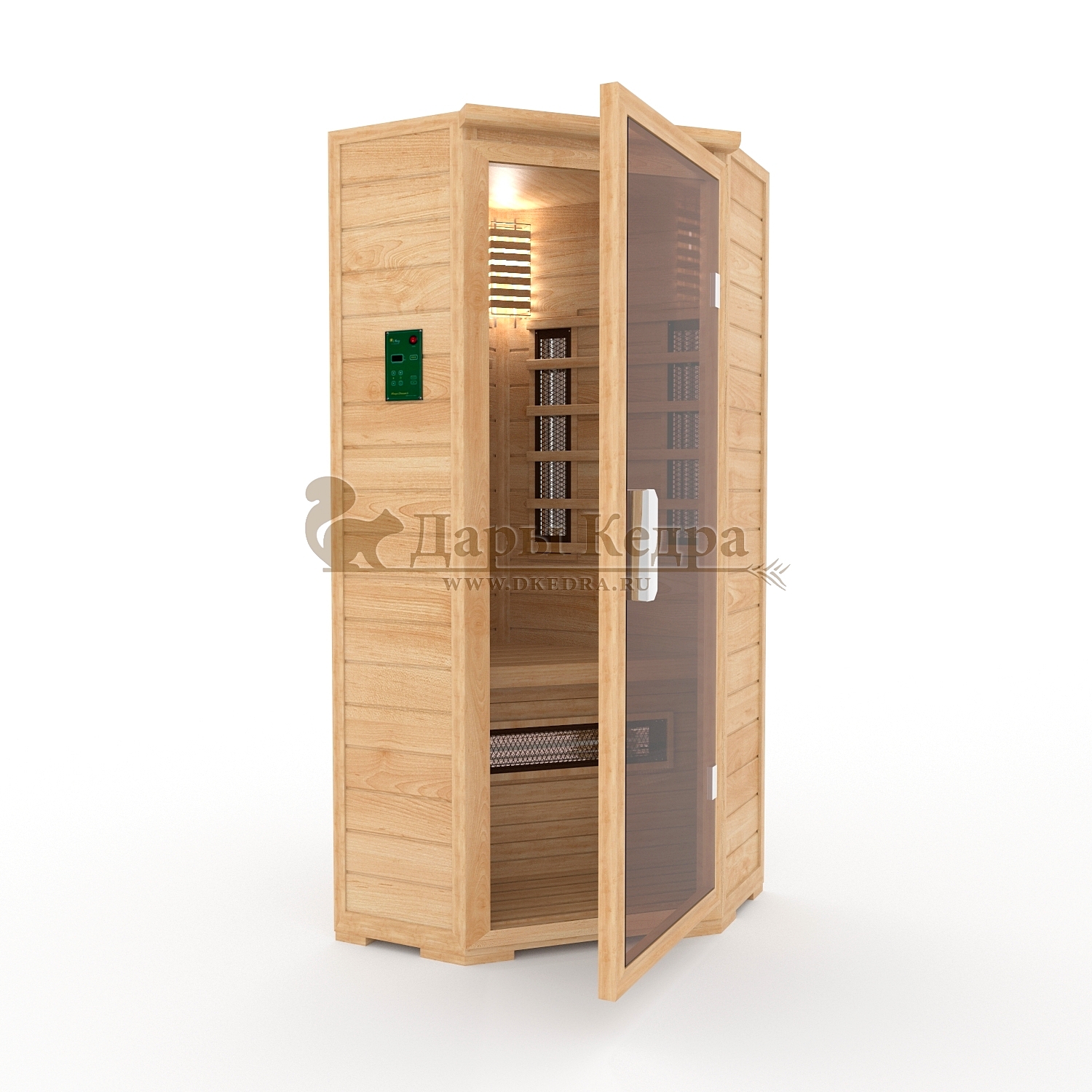 • Двухместная угловая инфракрасная сауна кабина из кедра и липы с карбоновыми излучателями Это специально оборудованная кабина из липы для прогрева тела человека сухим теплом. Воздух в таких парных не нагревается. Инфракрасные лучи воздействуют на тело, равномерно прогревая мышцы, суставы и органы. Карбоновые излучатели, встроенные в стены кабины, обладают мягким прогревом, что полностью исключает возможность ожога. Работает кабина за счет электричества. Установка сауны в угол, позволяет рационально использовать пространство помещения. Подходит как для домашнего использования, так и для коммерции. Обращаем Ваше внимание что в стандартную комплектацию входит трапик для ног, но вы можете его заменить на цельный пол совершенно бесплатно!