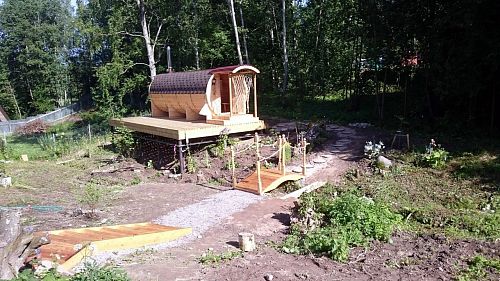 Здравствуйте! Давно собиралась написать отзыв и послать фотографии, но все как то руки не доходили. Сначала хочу сказать огромное спасибо всему коллективу Дары Кедра и отдельно Виктории, с которой мы постоянно общались по телефону. Все наши пожелания были учтены, все было корректно, оперативно и информативно. Мы конечно же, нервничали, не обманут ли, доедет ли, а вдруг не понравится, вдруг это только на фотографиях так красиво и интересно... И вообще, такая необычная баня, не будет ли там темно и страшно... Ох, сколько было сомнений и вот она приехала... Собрали сами, за 3 дня - очень хотелось посмотреть, что же это такое... Два дня мужу помогали друзья. Доделывал уже потом один. В процессе оказались 2 доски треснутые, пришлось склеивать. Больше никаких проблем не появилось. Инструкция понятная, никаких вопросов не возникло. Покрыли дополнительно мойку пропиткой. И вот - тадам! - готово! Можно топить и пользоваться! Ну что сказать - это просто чудо! Реальность превзошла все ожидания ))) А какой запах! Она так пахла, что все соседи удивлялись, какой необычный аромат! Внутри светло, уютно, для 4-х человек - идеально, места всем хватает. Муж поставил дополнительные лампочки в каждом помещении, поэтому света предостаточно. Установили водогрей за дверью в раздевалке. Хотя бака с горячей водой, который нагревается в парилке, достаточно. Просто голову помыть проточной горячей водой, более комфортно...Очень удобно оказалась печка с загрузкой на улице, - в бане нет мусора, нет дыма. Да прогуляться, проверить или подложить дров-после парилки - только в удовольствие. Топили каждый день, почти все лето. Такое вот у нас появилось развлечение на даче - каждый вечер в бане, и дети, и родители, и гости - все там. Уже с утра начинаются разговоры, во сколько пойдем вечером в баню...Греется она быстро, через час неспешной топки, уже можно идти парится. Родители дожидались, когда баня остынет до 60-50 градусов. В общем, довольны все! Спасибо огромное! Это потрясающее чудо и волшебство! Пожалели, что не заказали навес над входом. Доделывали уже сами. И не хватает ступенечек, порог высоковат. Тоже достроили. Но все это такие мелочи, по сравнению с самой баней! Она великолепна! И круглая форма придает ей такую необычность и изюминку.... В общем спасибо, мы всем рекомендуем вашу фирму и ваши бани! А сами мечтаем теперь о купели с холодной водой - поставить рядом и нырять после парной )))). Может быть закажем на следующие год. Спасибо еще раз за это чудо!
